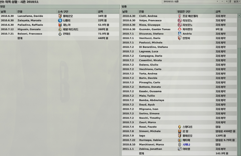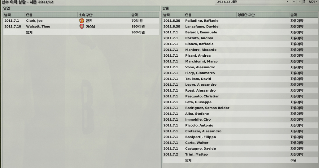 다음은 10-11 시즌과 11-12 시즌에 유벤투스의 이적 상황입니다 ㅋㅋ