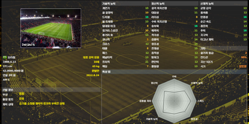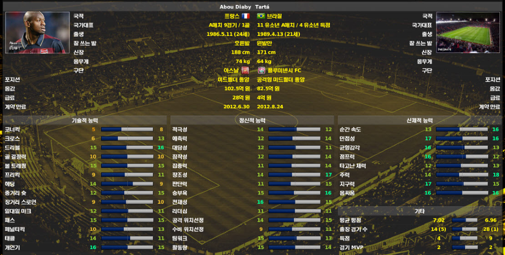 : 브라질산 디아비(?)가 아닌 생김새가 디아비와 비슷한 선수입니다. 이 선수의 히든 능력치중에서 꾸준함: 13, 중요경기: 12이며 짝퉁(?) 안데르손 냄새가 나는 선수입니다. 선수 능력치중에서 적응력을 제외한 모든 능력치가 고정입니다. 정신적인 능력 - 프로의식: 13, 스포츠맨쉽: 14, 충성도: 14, 참을성: 14, 발언: 11, 압박: 15, 야망: 15를 가진 브라질 출신치고 준수한 성격도 가지고 있습니다. 마지막으로, fm 시작시 칼슈타인님의 kal-ddt와 클라렛님의 Big World ddt에 작음으로 설정하여서 시작하였습니다.