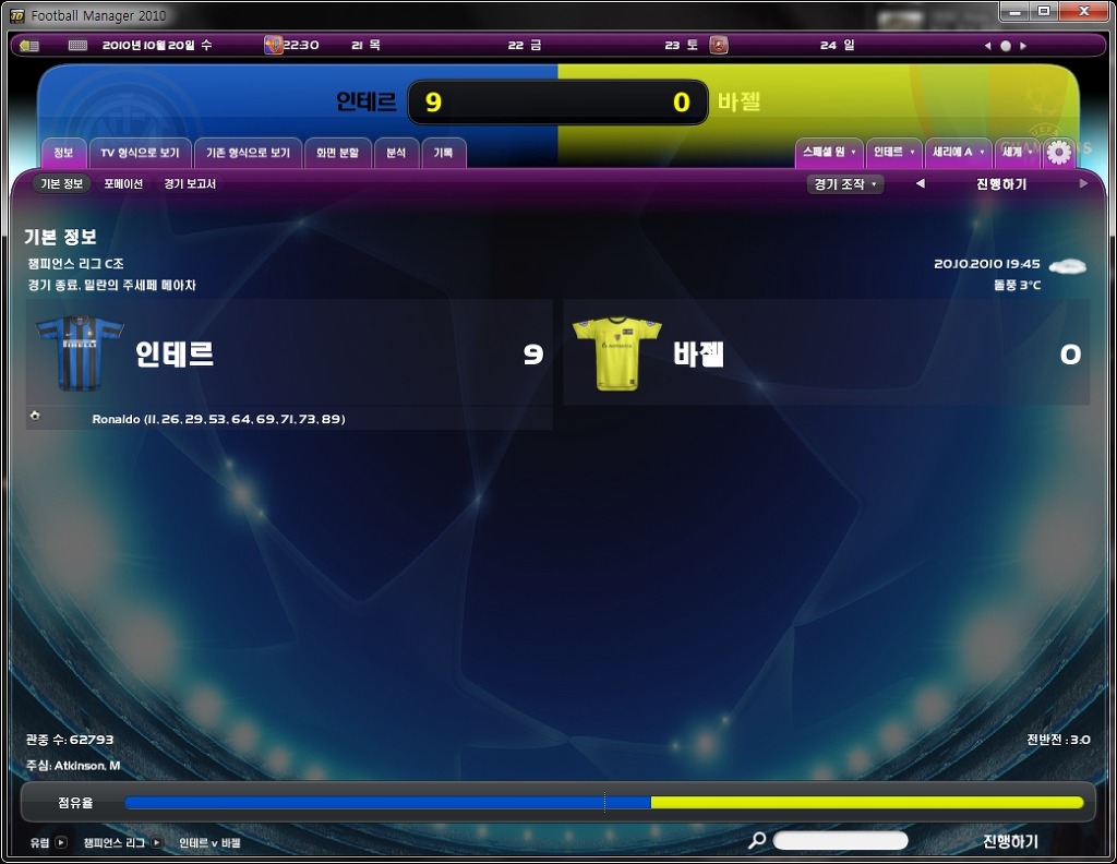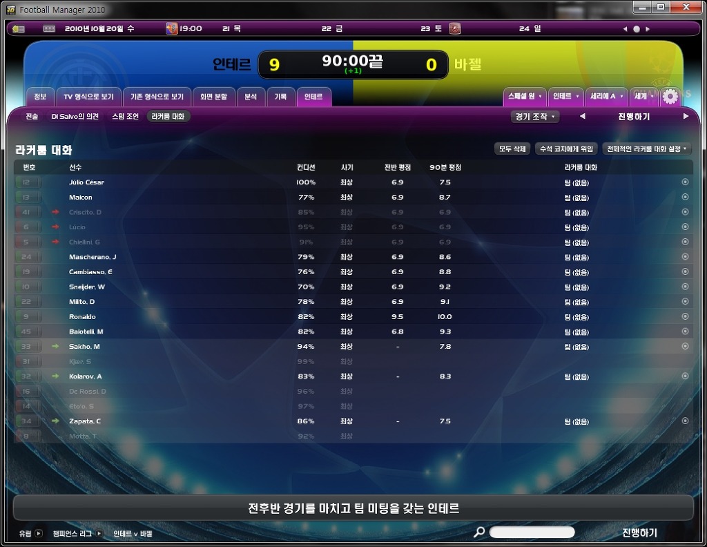 챔스 조별예선에서 바젤과의 경기인데, 인테르가 9:0으로 이겼습니다.