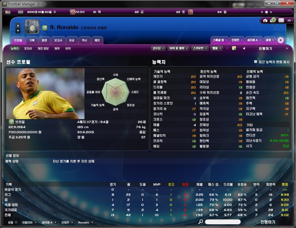 이제 13경기 뛰었는데 42골 넣었네요;;;; 평균평점은 9.02점.