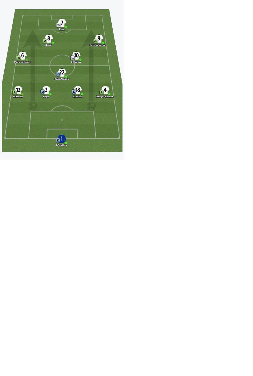 결과는 트레블하였고 대부분의 상은 호날두가 휩쓸었고 카시야스 골키퍼 1위, 박지성 선수가 라리가 올해의 선수를 타게 되었습니다.알렉스퍼거슨경의 전술을 모티브로 하여 만들었습니다. 맨유특유의 빠른 템포로 공격적이면서 역습을 중심으로 하는 공격적인 역습 전술입니다.수비라인을 올렸지만 강한 압박수비를 바탕으로 하여 상대의 공격에 대비할수 있습니다.원래 거의 패배하지 않았는데 전술 초기에 테스트 기간중에( 수정 이전) 패한것이니 참고하시길 바랍니다.리그우승,챔피언스리그우승,국왕컵 우승