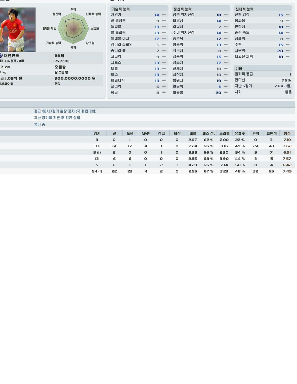 ML(박지성):와이드미드필더 공격:맨유에서의 박지성 선수 역할을떠올리시면 됩니다. 활동량과 팀웍이 매우 중시되는 포지션입니다. 멘탈의 부분도 고려하셔야하는 자리입니다. AMR의 공격적 성향으로 인하여 발생될수 있는 수비문제를 커버해주는 포지션이며 팀에 전체적으로 엔진역할이며 활력소가 되어주는 자리입니다. 매우 중요한 자리이니 박지성 선수와 비슷한 유형의 선수로 써주셔야합니다. AMR과 함께 팀내 공격의 주루트가 되어주는 중요한 포지션입니다.EX)드렌테,제임스밀너(아스톤빌라),조나스(뉴캐슬),바르가스(피오렌티나),마르셀로 등등
