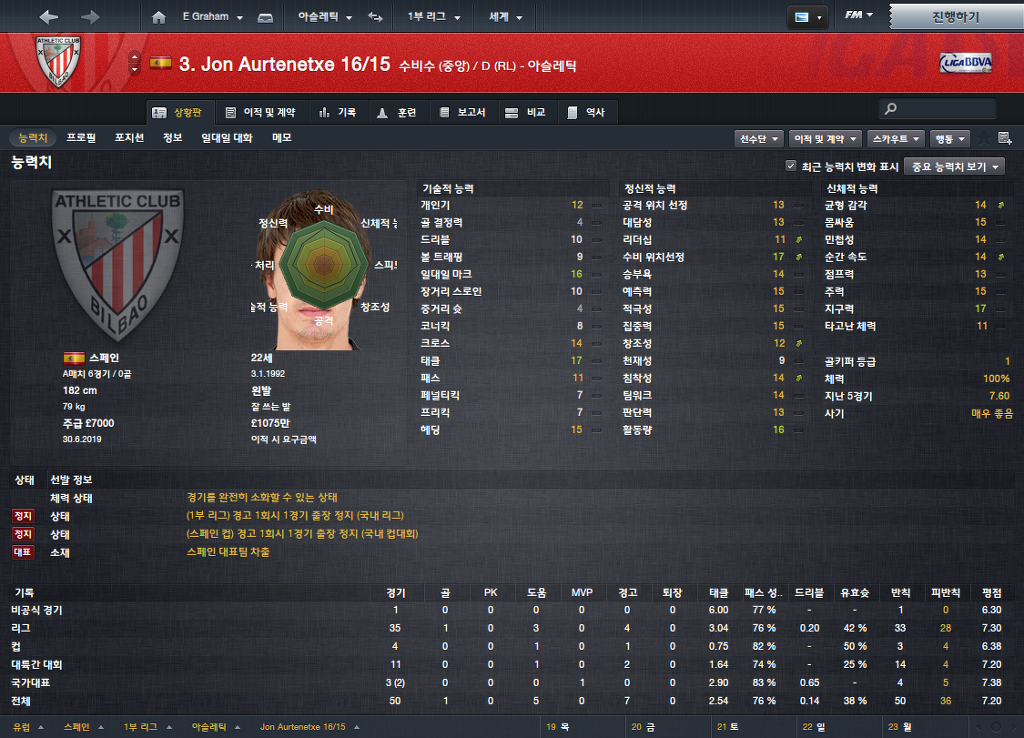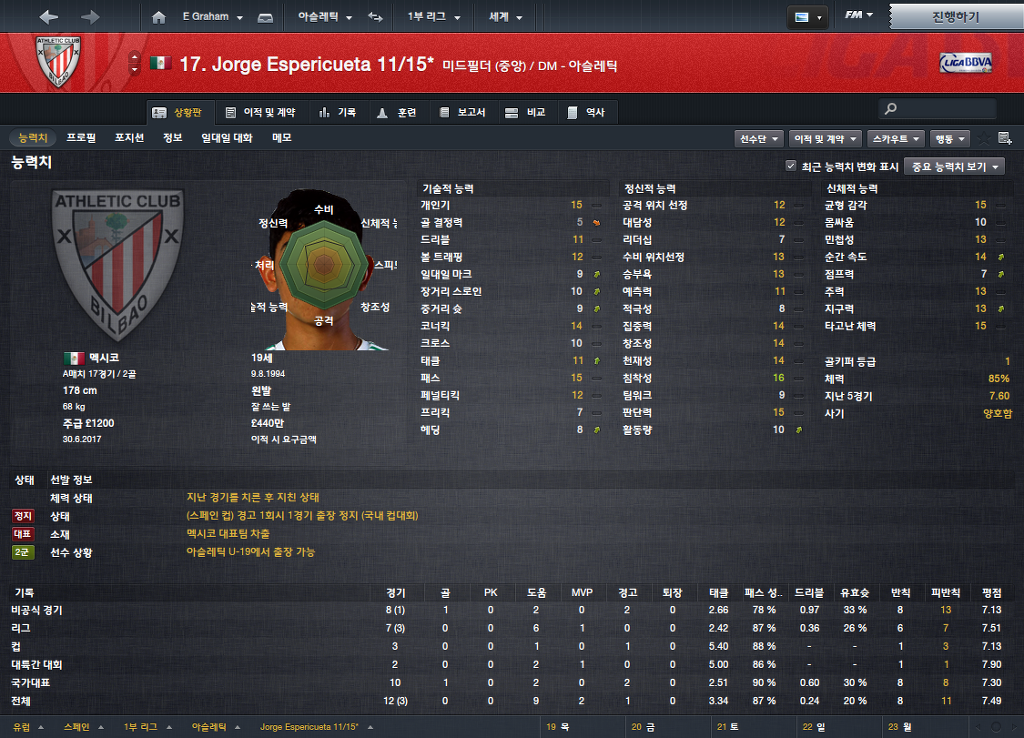 만능백업 아우테네체도 스페인 국가대표에 적응해가는 느낌입니다. 고루고루 분포된 능력치지만, 풀백들이 안정감을 찾으면서 올 시