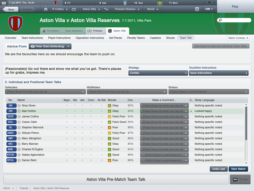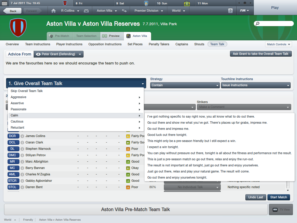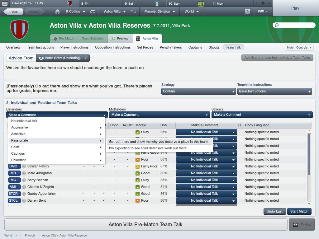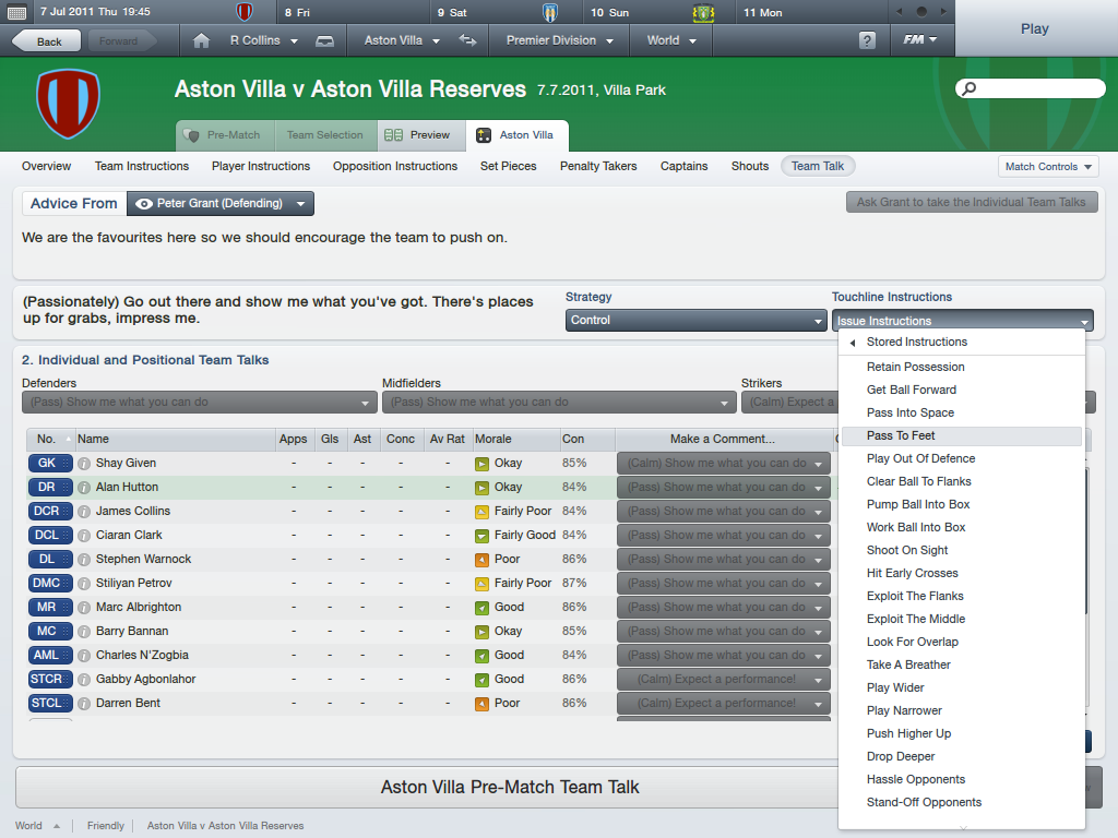 그리고 Team Talk에서 전술의 성향(2011에서 지배형, 역습형 등으로 등장했던 것)과 지시 사항 하나를 정할 수 있습니다.