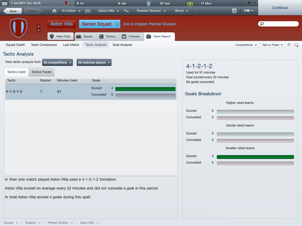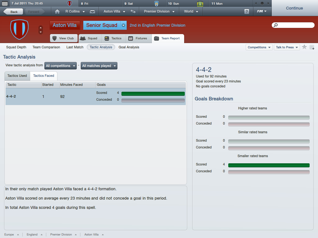Tactic Analysis(전술 분석)을 통해 어떤 전술을 썼을 때의 득실점, 그리고 어떤 전술을 상대했을 때의 득실점을 모두 파악할 수 있습니다. 경기를 많이 하다보면 유용한 자료가 될 듯 합니다.