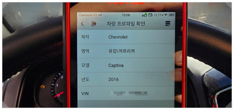 차량 OBD 단자에 쉐보레 전용 진단기를 연결하고 통신을 시작합니다.