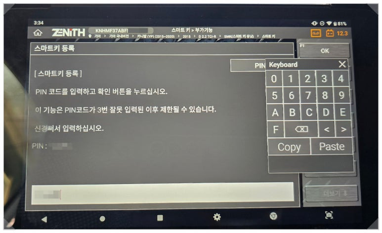 고유의 보안 코드인 핀코드(Pin Code)를 입력하여 스마트키 등록을 진행합니다.