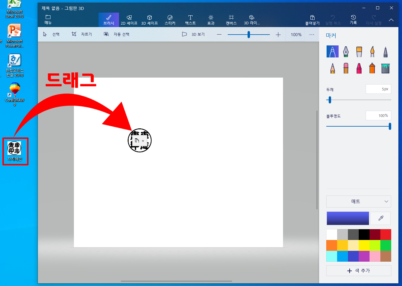 이제 저장해놓았던 도장파일을 드래그하여 그림판3D안으로 끌어다 놓으시면 됩니다.