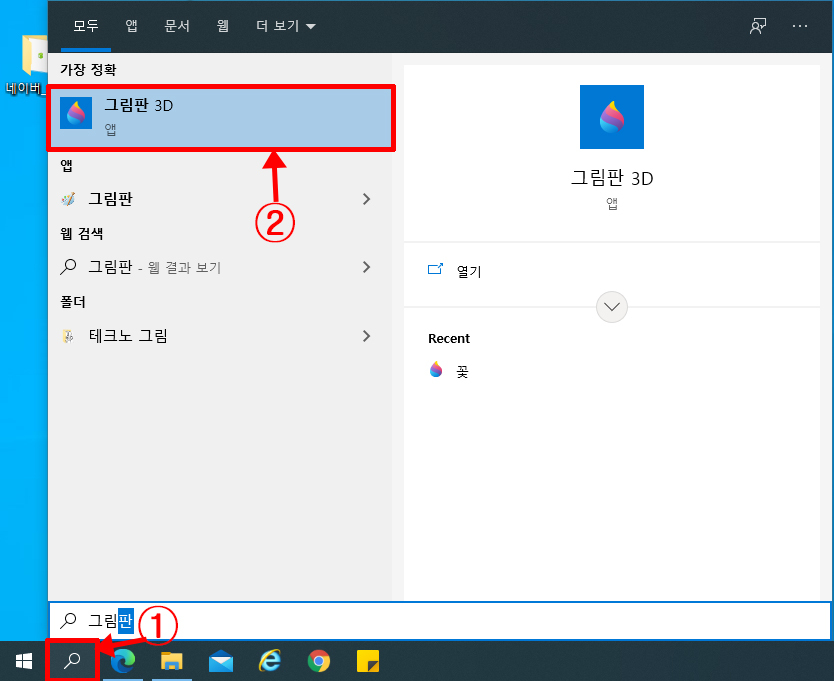돋보기 클릭후 그림판이라고 입력하시면 '그림판3D'가 검색됩니다. 클릭해주세요.