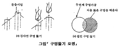 2) 경사면 구멍뚫기: 공작물의 사선부를 미리 돌출시키거나 엔드밀로 깎아낸다.