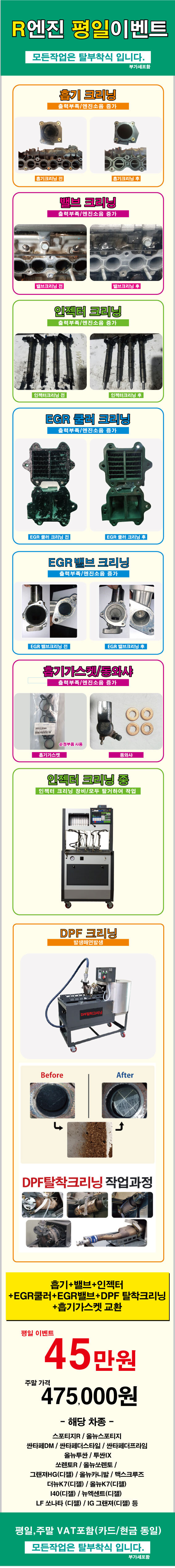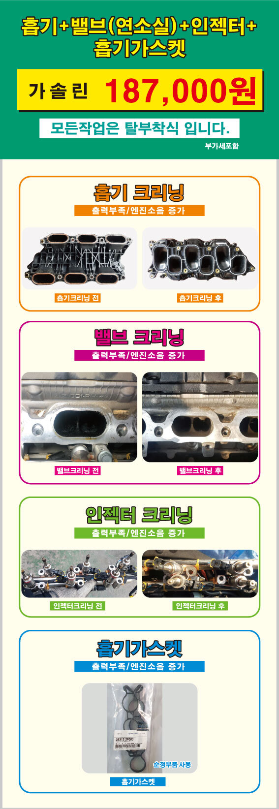 작성자전진공업사 작성자 본인 여부 작성자 작성시간 22.04.14 크리닝 작업 소요시간은 3-4시간 정도입니다.