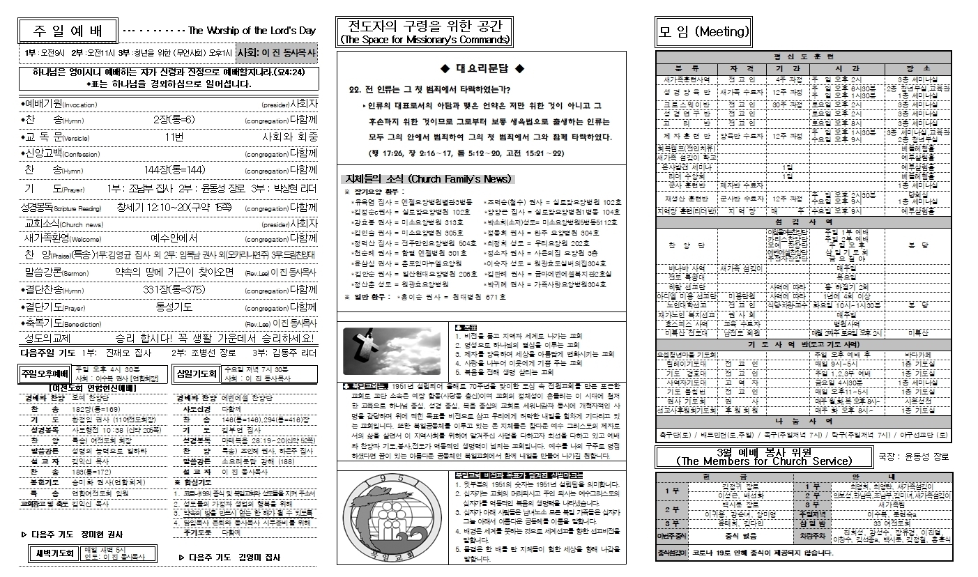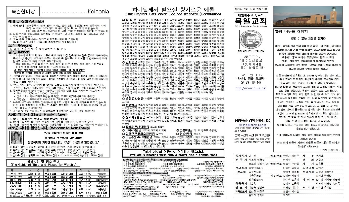 북일교회 2021년 3월 14일 주보입니다. 작성자사호행(명랑아)|작성시간21.03.13|조회수102 목록 댓글 0 글자크기 작게가 글자크기 크게가 장년주보(2021년 3월 14일).pdf462.95KB 첨부파일첨부된 파일이 3개 있습니다. jpg 파일 장년주보(2021년 3월 14일)002.jpg 다운로드 jpg 파일 장년주보(2021년 3월 14일)001.jpg 다운로드 pdf 파일 장년주보(2021년 3월 14일).pdf 다운로드 다음검색 현재 게시글 추가 기능 열기 북마크 신고 센터로 신고 댓글 댓글 0 댓글쓰기 답글쓰기 댓글 리스트