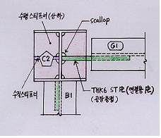 부재 용접시 이음 및 접합부위의 용접선이 교차되어, 재용접된 부위가 열영향을 받아 취약해지므로 모재에 부채꼴 모양의 모따기를 한것.(Scallop의 반지름은 30㎜를 표준으로 한다)