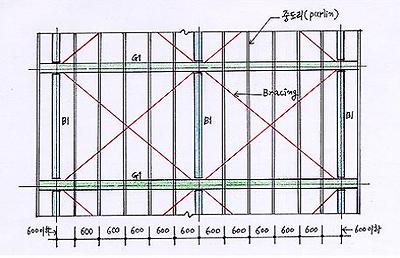․중도리(purlin)의 설치간격은 @600으로 균등하게 설치