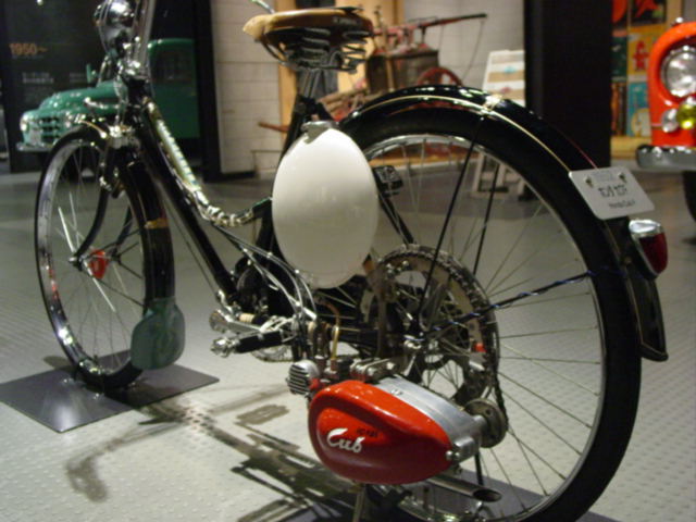 배기량 49.9cc·최고 출력 1ps/3,600rpm의 2행정 엔진이 최대의 특징으로서 재래형 보조 모터와 달리 뒷바퀴 왼쪽 측면에 탑재돼 구동 장치도 모두 후륜 부근에서 완결하는 구조를 채용했습니다. 이로 인한 오일 비산에 의한 승객의 탑승 시 문제가 해결되었고, 취급 업자에게 있더라도 자전거에 장착하는 작업이나 유지 보수의 간이화를 실현했습니다. 순백의 법랑 처리된 연료 탱크와 "Cub"의 로고가 들어간 붉은 엔진 커버에서 " 흰 탱크에 붉은 엔진"의 슬로건이 붙었습니다.