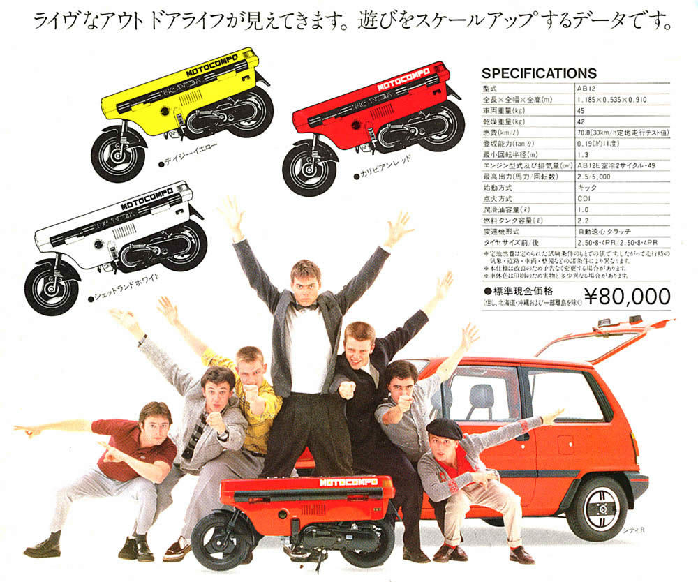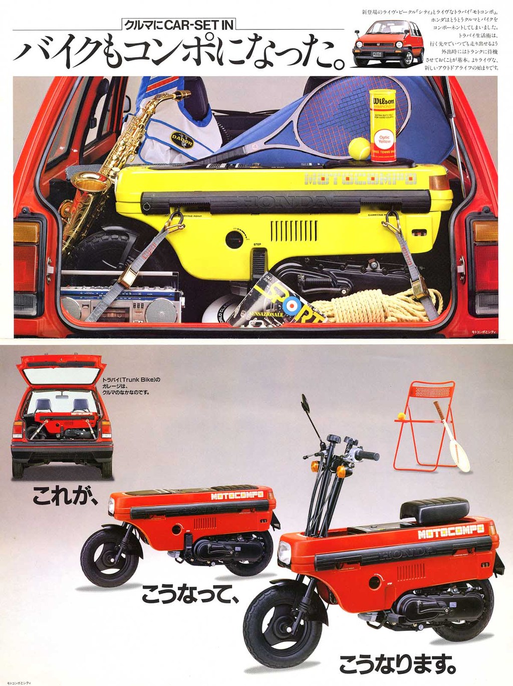 동 회사의 콤팩트 카 "시티"(제일 위쪽 사진의 모토콤포를 싣고 있는 자동차입니다)의 트렁크 룸에 넣자는 콘셉으로 개발되었습니다. 1981년 10월 29일 발표, 그 해 11월 11일 출시로 초기형 시티와 동시 발표, 동시 발매였습니다. 당시의 판매 가격은 8만엔. 당초부터 사륜의 시티와 이륜의 모토콤포를 동시에 개발하고 있었으며 그 독특한 시도로 주목 받았습니다.