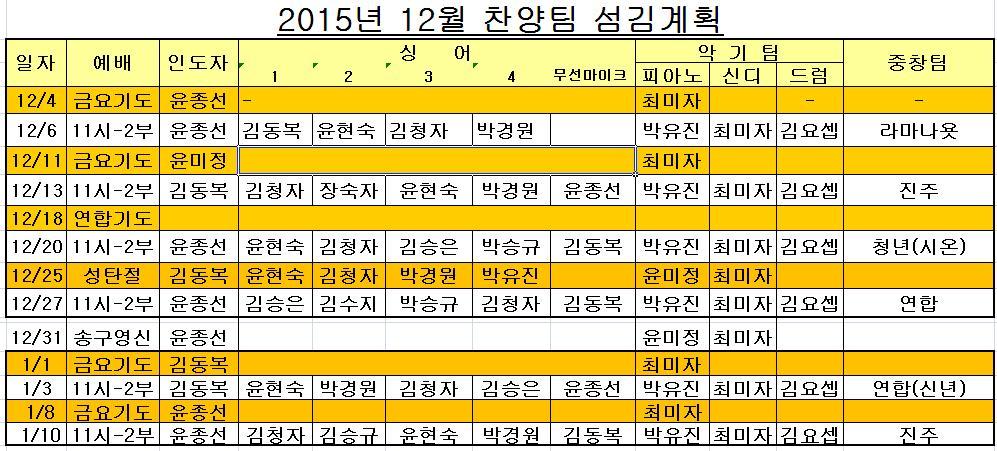 12월 섬김계획표입니다 작성자셋아빠|작성시간15.12.11|조회수27 목록 댓글 0 글자크기 작게가 글자크기 크게가 12월 섬김계획표입니다. 12월은 성탄절 송구영신예배가 있습니다. 모두 예배의 자리에 나와 찬양으로 영광돌리는 찬양팀이 되길 바랍니다 2015년 12월_찬양팀섬김계획.xlsx 첨부파일첨부된 파일이 2개 있습니다. jpg 파일 2015-12월.jpg 다운로드 xlsx 파일 2015년 12월_찬양팀섬김계획.xlsx 다운로드 다음검색 현재 게시글 추가 기능 열기 북마크 공유하기 신고 센터로 신고 댓글 댓글 0 댓글쓰기 답글쓰기 댓글 리스트
