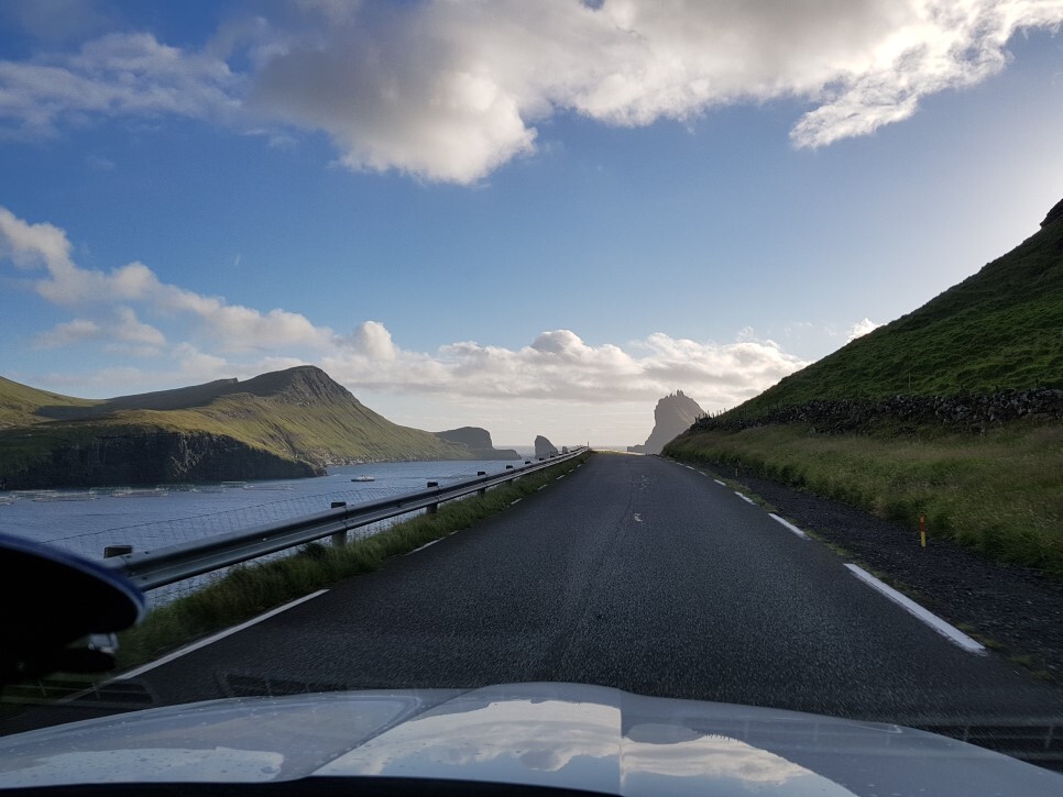 보가르섬의 또 다른 명소 드랑가르닐(Drangarnir)과 틴도홀무(Tindholmur)도 도로 끝 저 멀리 보인다.