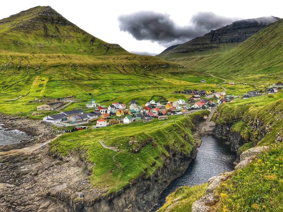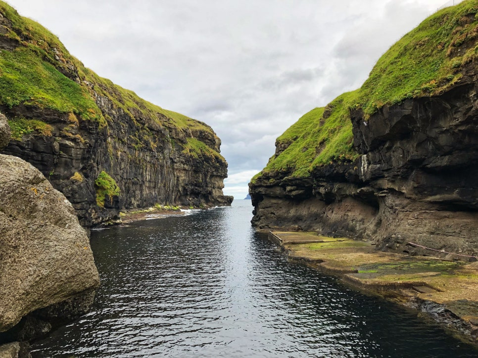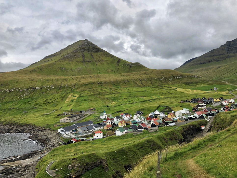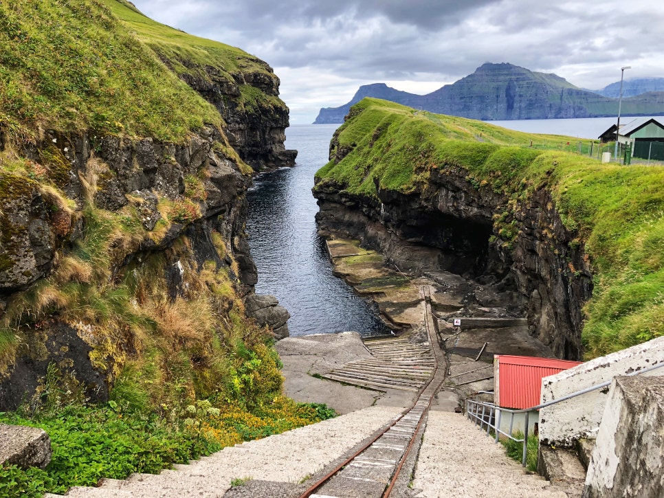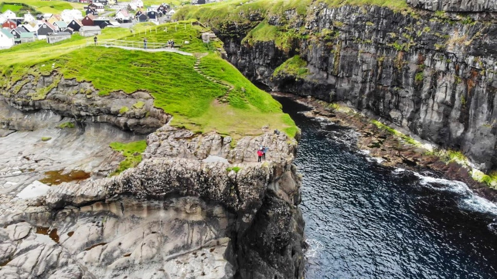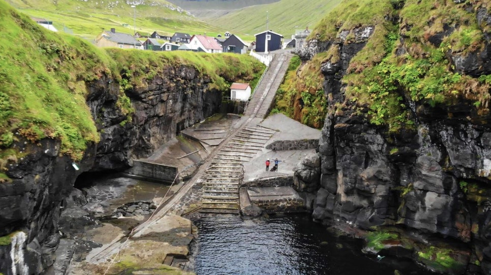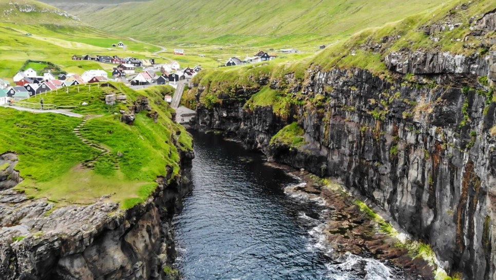 같은 이스터로이섬 북쪽에 있는 죠그로 출발했다 에이디 마을에서 죠그로 가는 길에는 펀닝굴(Funningur)마을 옆을 지나게 된다. 이 마을을 낀 내리막 도로에는 심한 커브길이 나있다. 흐린 날씨였지만 도로 정상점에서 내려다보는 Z자 로드 뷰와 바다 전망은 감탄을 자아냈다. 이스터로이 섬에서 가장 북쪽에 있는 작은 마을이다. 죠그 즉 ‘Gjogv’라는 단어는 페로어로 ‘협곡’을 의미하는데, 마을에서 바다로 이어지는 200m 길이의 협곡을 상징하여 마을 이름이 지어졌다고 한다. 페로제도의 대표 협곡 마을 죠그를 보기 위해 문을 나섰다. 죠르누비크까지만해도 화창했던 날씨가 또다시 변덕을 부리기 시작하더니 점점 구름이 많아졌다. 서둘러 도착한 협곡의 입구에는 그곳이 선착장임을 보여주듯 오래된 수레용 레일과 계단이 있었다. 그리고 그 앞에 깊숙이 파여 양쪽으로 절벽을 이룬 커다란 협곡이 나타났다. 양쪽의 거칠고 굴곡진 절벽 위로 녹색 잔디가 깔려 있는데 그 모습이 마치 담요를 두른 듯 포근해 보이면서도 거칠고 험한 모습이었다. 그 사이로 흐르는 바닷물은 마치 호수처럼 잔잔했다. 우리는 높은 곳에서 죠그 풍경을 조망해보기 위해 위로 올라가 보기로 했다. 선착장을 기준으로 오른쪽 절벽이 짧은 구간이고, 왼쪽이 좀 더 꼬리가 긴 형태로 마을을 둘러싼 산과 연결되어 있다. 두 지형을 모두 오르내리며 각기 다른 위치에서 전망을 감상했는데, 모든 뷰가 멋있었지만 왼쪽으로 길게 뻗은 절벽 위에서 마을 쪽을 바라본 모습이 특히나 인상 깊었다. 앞에는 북대서양이 펼쳐져 있다. 협곡 너머로 형형색색의 삼각 지붕과 오두막들이 옹기종기 모여 있는 모습이 동화 속 장면을 보는 듯 아름답고 매력적이었다. 선착장 너머로 길게 뻗은 트레킹 길이 멋스럽다. 실제로 죠그마을은 2014년 노르딕 자연환경 보전위원회 (Nordic Council of the Nature & Environmental Award)가 선정한 조용하고 잘 보존된 마을로 꼽혔다고 하니 마음의 안정을 얻기에 여기 만한 곳이 없을 것 같다. |