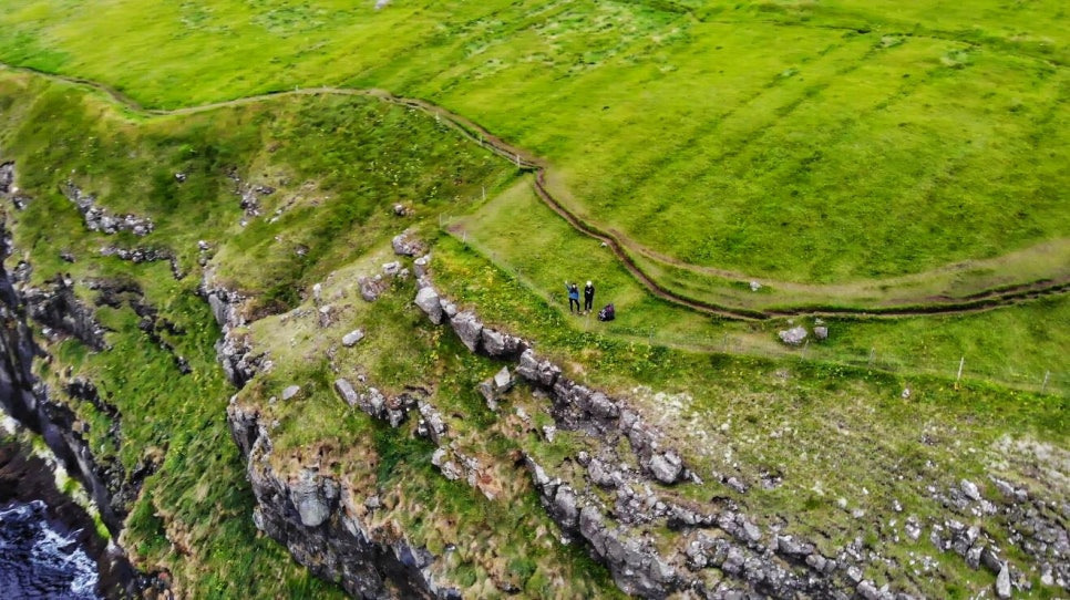 드론으로 촬영한 포사 폭포 정상부, 뚜렷한 빙하의 침식 단층을 볼 수 있다.