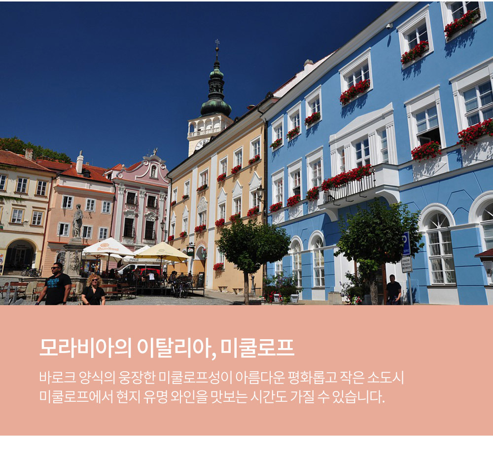 “모라비아의 이탈리아”라 불리는 미쿨로프는 동유럽 최고의 와인산지이며, 오스트리아 접경지역으로 비엔나와는 버스로 1시간 정도 밖에 걸리지 않습니다. 16세기 중반 유대인들의 종교 도피처로 이용되어 모라비아 지방에서 가장 많은 유대인이 살았고, 2차 세계대전 이후 그 수가 많이 줄었지만 유대인 묘지와 시나고그(예배당) 등 유대교 유적지가 많이 남아 있습니다. 또한 도시 중앙광장에는 르네상스와 바로크 양식의 집과 교회가 많이 남아 있기도 합니다. 미쿨로프 관광의 하이라이트는 1560년부터 1945년까지 이 지역을 통치한 디트리히슈타인 가문의 무덤과 언덕 위의 웅장한 바로크 건축물 미쿨로프 성이 있습니다.
