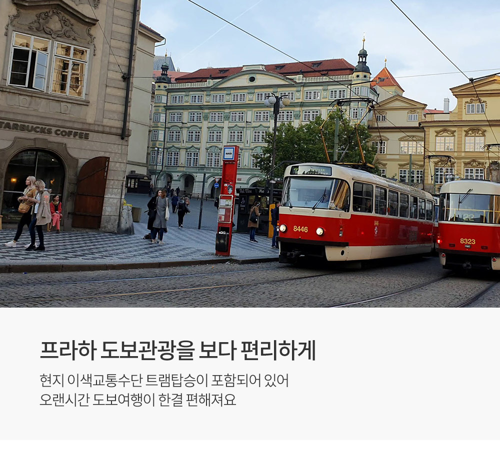 프라하 구시가지는 버스 진입이 불가하여 걷는 구간이 많습니다. 먼 거리는 트램을 이용하여 편안하게 이동하세요.