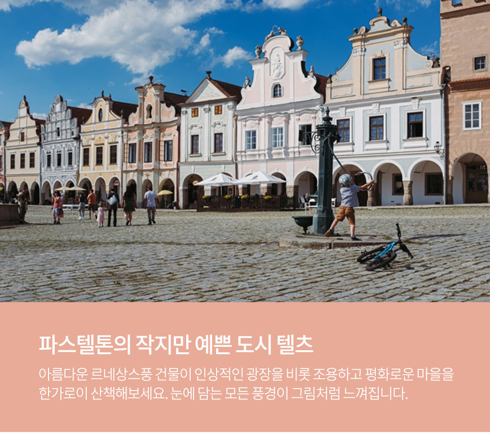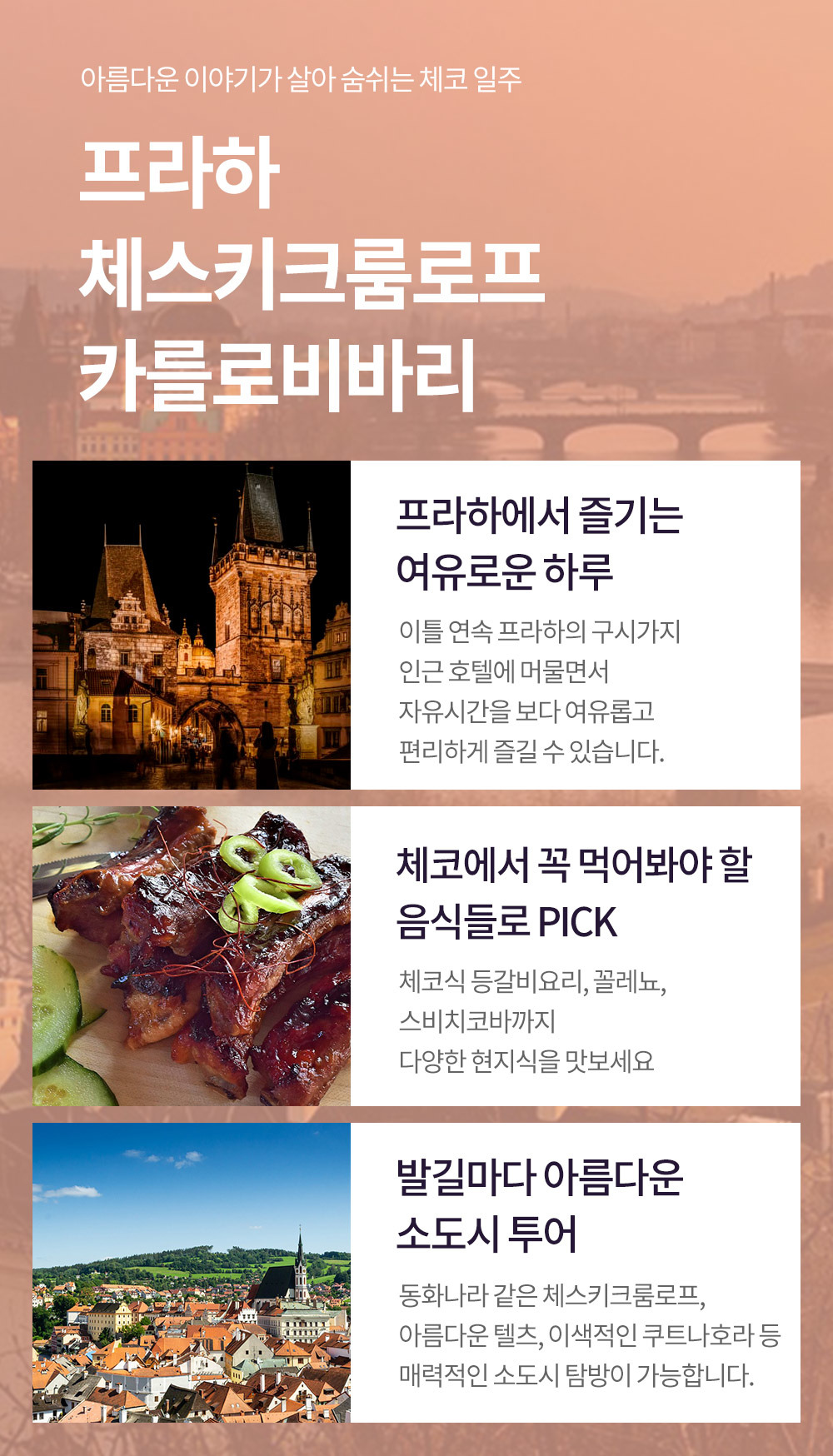 체코의 수도이며 천년의 역사를 지닌 신비스러운 도시입니다. 거리 곳곳에는 고딕 양식, 르네상스 양식, 로마네스크 양식, 바로크 양식의 건축물들이 들어서 있으며 작은 골목 하나에도 중세의 향기가 배여있습니다. 프라하는 중부 유럽의 문화적 역사적 중심지 중 하나로 1992년 유네스코 세계 문화유산으로 지정되었습니다.