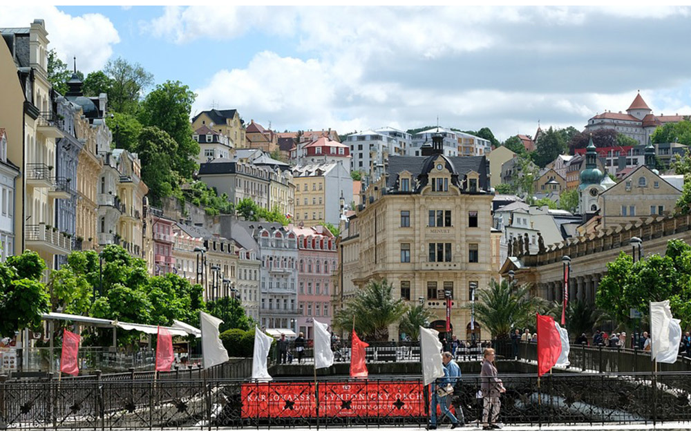 카를로비 바리는 오흐르제강과 따뜻한 테플라 강이 만나는 곳에 위치한 매력적인 마을입니다. 나무가 우거진 언덕 틈에 위치여 동화적인 느낌이 더 강하고 의학적 효능이 있다고 생각하는 뜨거운 광천수 샘물이 솟아나며, 열 두 개의 큰 샘물은 잘 개발되어 이 도시에 온천을 제공해줍니다. 카를로비 바리라는 마을 이름을 글자 그대로 해석하면 '카를의 온천'이라는 의미입니다.