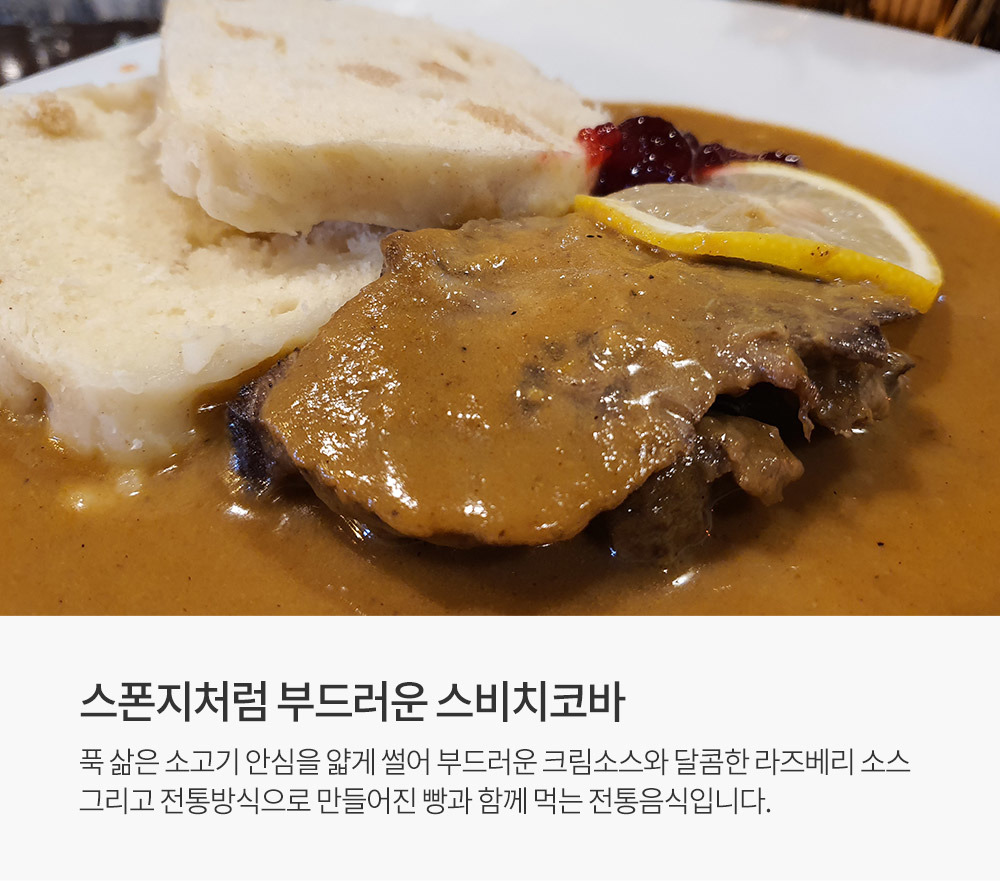 - ① 말랑말랑한 빵과 달콤한소스를 곁들인 소고기요리의 체코 대표 가정식 "스비치코바"