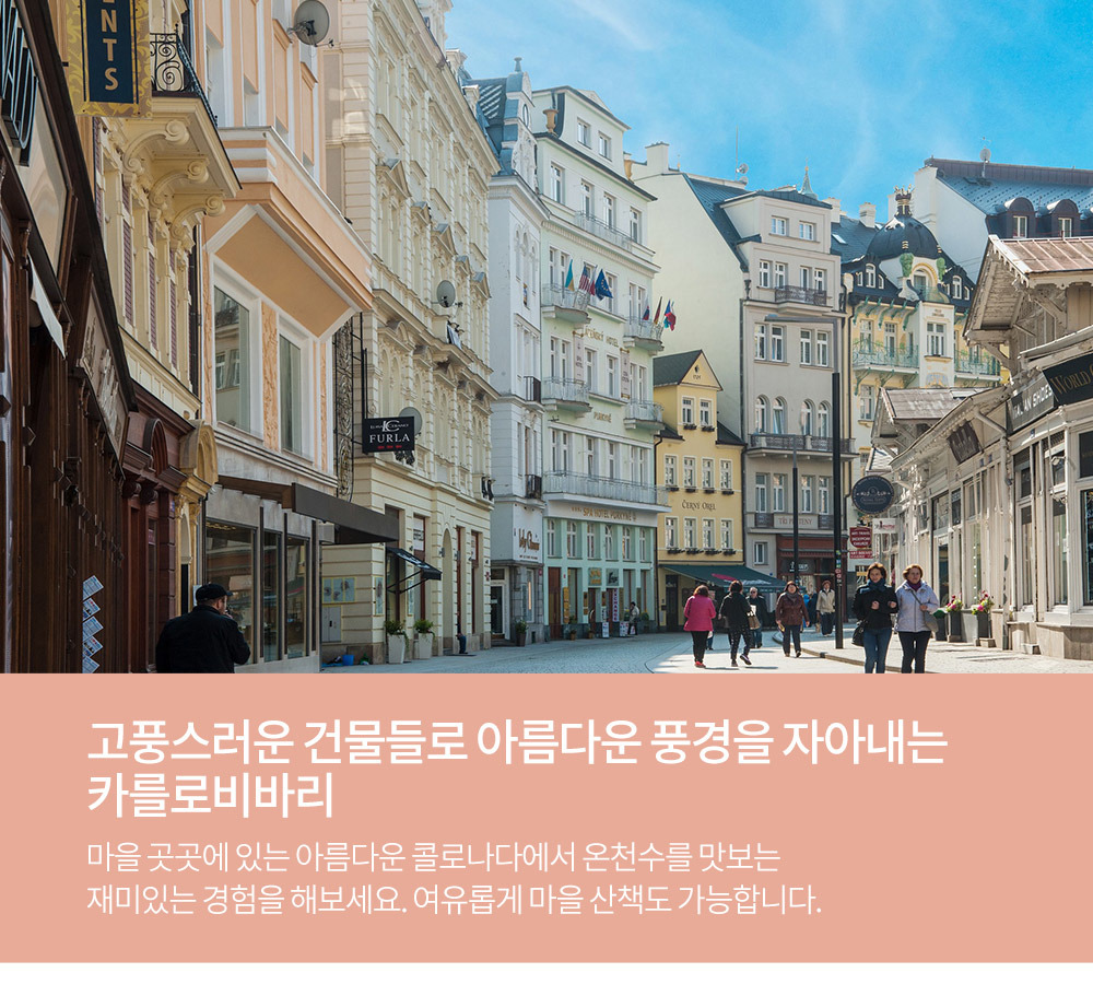 프라하 서쪽에 위치한 카를로비바리는 온천과 영화제로 잘 알려진 곳입니다. 과거 사냥을 즐겨 하던 카를 4사에 의해 온천이 발견되었으며 카를로비바리의 온천은 몸을 담그는 온천욕뿐 아니라 시음하는 치료법으로도 유명합니다. 거리를 산책하면서 온천수를 마실 수 있는 장소가 있고, 각기 다양한 모양의 온천수 전용 컵을 판매고 있어 선물용으로도 인기가 좋습니다. 도시 건물 대부분은 19~20세기에 지어진 온천 건물이며, 많은 관광객들이 찾는 인기 관광지입니다.