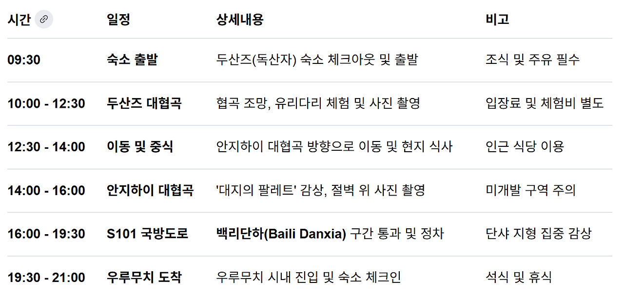 | 백리화랑(百里畵廊) | 탕부라 (Tangbula) | 도로 자체가 하나의 거대한 화랑입니다. 6월에는 갓 피어난 야생화와 맑은 계곡물이 어우러져 가장 생기 넘칩니다. | 선녀호(仙女湖) 트레킹 코스, 도로변에 핀 이름 모를 야생화 군락지 |