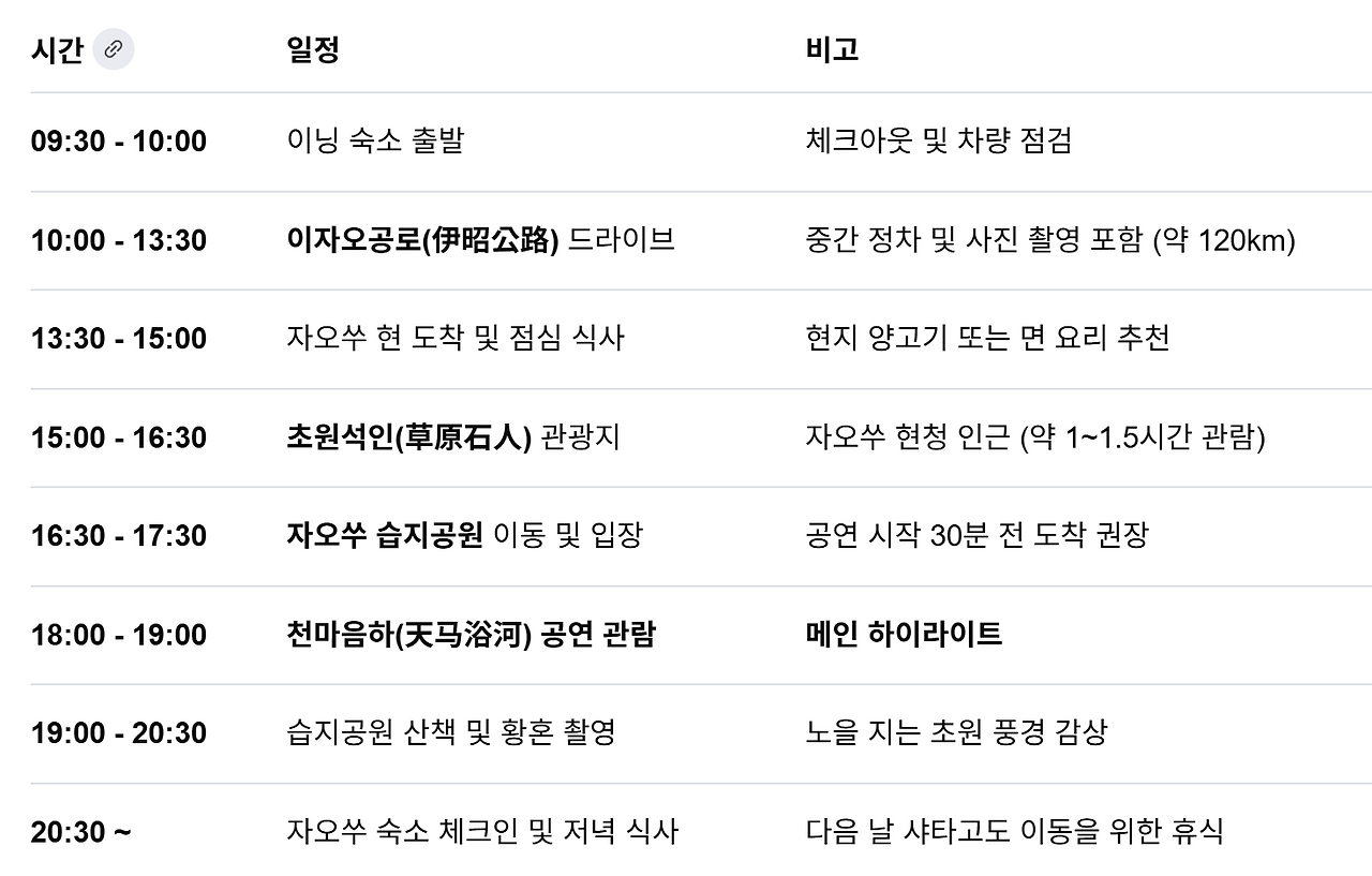 | 이닝숙소 ~이자오공로(伊昭公路)~초원석인(草原石人)~자오쑤 현~샤타고도 삼림공원(夏塔古道国家森林公园) 이자오 공로 (S237) & 백석봉 (바이시펑) 전망대 굽이치는 고갯길과 만년설 조망를 하면서 드라이브를 즐길수 있는 '천상 노선'이라 불리는 이자오공로 로 진행 합니다 중국 아름다운도로 중 하나로 보통 6월~9월 단 3개월만 개방되며 최대 7인승 SUV 차량으로 주행가능한 도로입니다. 촬영 포인트: 백석봉 전망대에서 내려다보는 우순산의 깎아지른 듯한 암벽과 구불구불한 도로의 조화가 압권입니다. 신장의 절경을 만끽할 수 있는 대표적인 드라이브 경로입니다. 자오쑤 습지공원 (천마음하 공연) 매일 오후 '천마음하(天馬浴河)'라 불리는 수백 마리의 말이 강물을 가르며 달리는 장관을 볼 수 있습니다. 촬영 포인트: 말이 물보라를 일으키며 달리는 순간을 셔터 속도를 높여 연사로 촬영하세요. 강가 관람석이 명당입니다. |