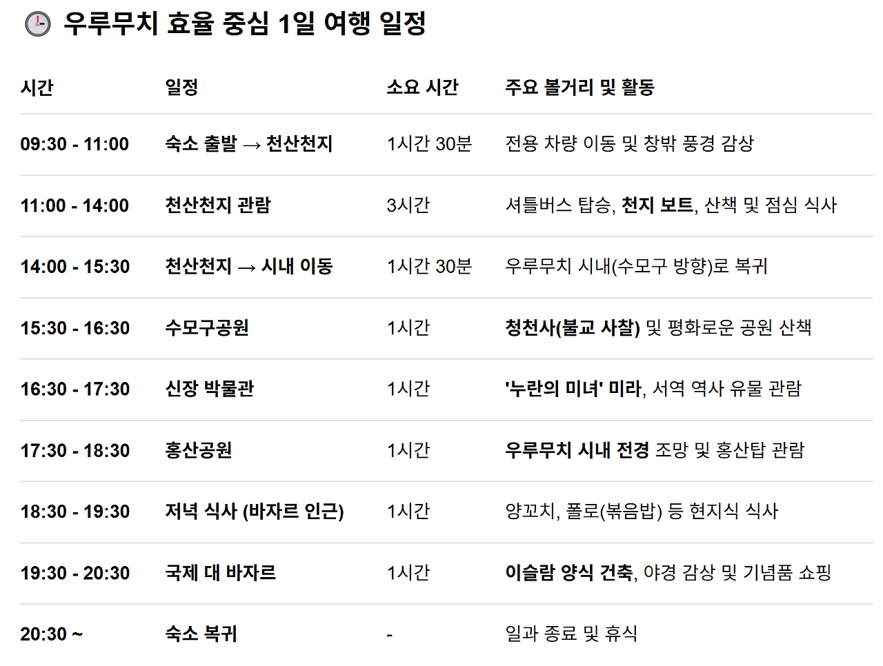 우루무치의 핵심 자연 경관인 천산천지부터 시내 역사 문화 명소까지 알차게 둘러보는 1일 여행 일정입니다. 천산천지 (Tianshan Tianchi): 유네스코 세계자연유산으로, 만년설이 덮인 보거다 봉 아래 펼쳐진 에메랄드빛 호수입니다. 셔틀버스와 케이블카를 이용해 고산 지대의 비경을 감상합니다.