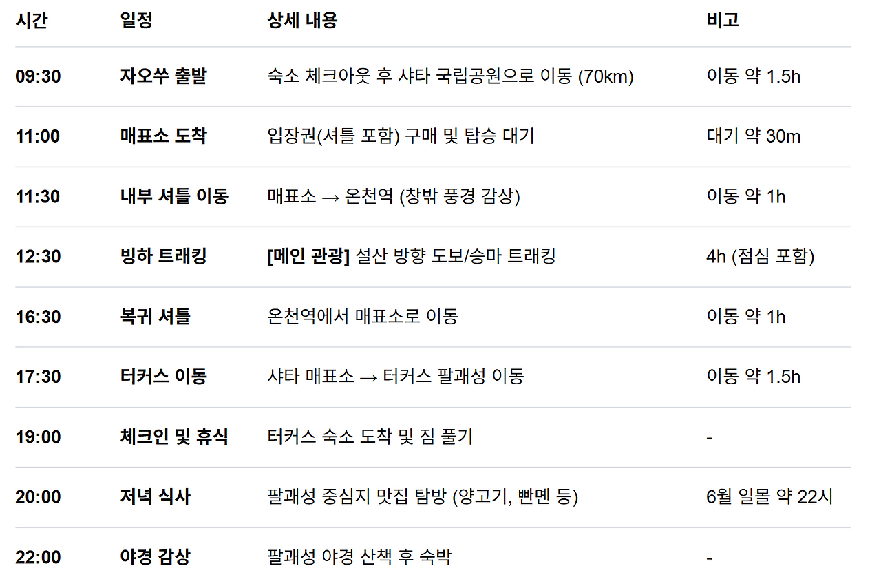 | 6일차/ 자오쑤 → 샤타 국립공원매표소 ~샤타 고도 트래킹 ~ 터커스 이동 |