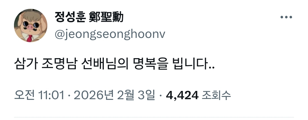 [[근조]]조명남 성우님의 명복을 빕니다 작성자푸른너구리|작성시간26.02.05|조회수235 목록 댓글 0 글자크기 작게가 글자크기 크게가 2월 3일에 정성훈 님 X에 부고가 올라왔더군요... 떠돌이 까치의 까치 아빠로 유명하신 분입니다. 다음검색 현재 게시글 추가 기능 열기 북마크 공유하기 신고 센터로 신고 댓글 댓글 0 댓글쓰기 답글쓰기 댓글 리스트