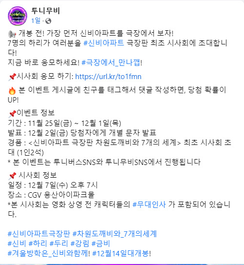 [[정보]]투니무비 신비아파트 극장판 차원도깨비와 7개의 세계 최초 시사회 이벤트 작성자흑태자Kai|작성시간22.11.27|조회수527 목록 댓글 0 글자크기 작게가 글자크기 크게가 출처:투니무비 공식 페이스북 https://www.facebook.com/toonimovie/photos/a.444092235765698/2292930127548557/ 2022. 11. 25 신비아파트 공식채널 - Shinbi House YouTube https://www.youtube.com/watch?v=JITQrfRTk4o출처:네이버 영화 다음검색 현재 게시글 추가 기능 열기 북마크 공유하기 신고 센터로 신고 댓글 댓글 0 댓글쓰기 답글쓰기 댓글 리스트