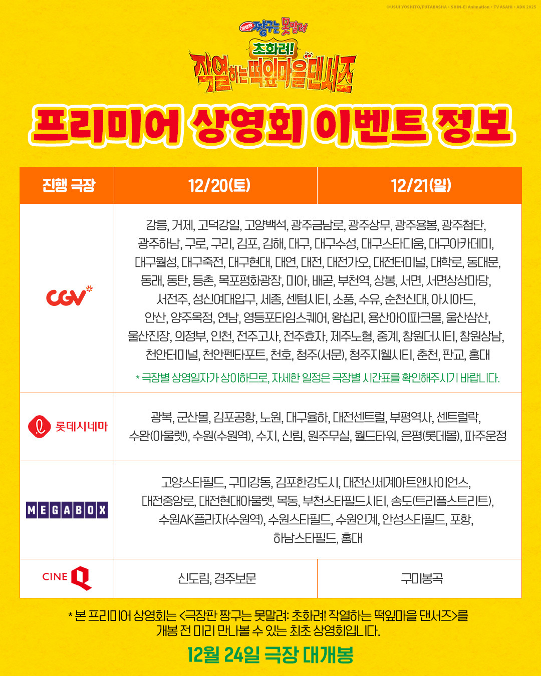 [[정보]]극장판 짱구는 못말려: 초화려! 작열하는 떡잎마을 댄서즈 프리미어 상영회! 작성자흑태자Kai|작성시간25.12.15|조회수1,049 목록 댓글 0 글자크기 작게가 글자크기 크게가 출처:투니무비 instagram https://www.instagram.com/toonimovie/p/DSCFDmtASGY/2025. 12. 13 출처;강수진과 빛의덕후단 youtube https://youtu.be/gjZRxpmuUL0 다음검색 현재 게시글 추가 기능 열기 북마크 공유하기 신고 센터로 신고 댓글 댓글 0 댓글쓰기 답글쓰기 댓글 리스트