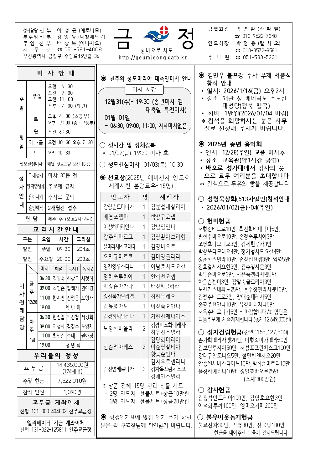 12월28일 본당 주보 작성자김광태(홍보분과)|작성시간25.12.25|조회수128 목록 댓글 0 글자크기 작게가 글자크기 크게가 다음검색 현재 게시글 추가 기능 열기 북마크 공유하기 신고 센터로 신고 댓글 댓글 0 댓글쓰기 답글쓰기 댓글 리스트