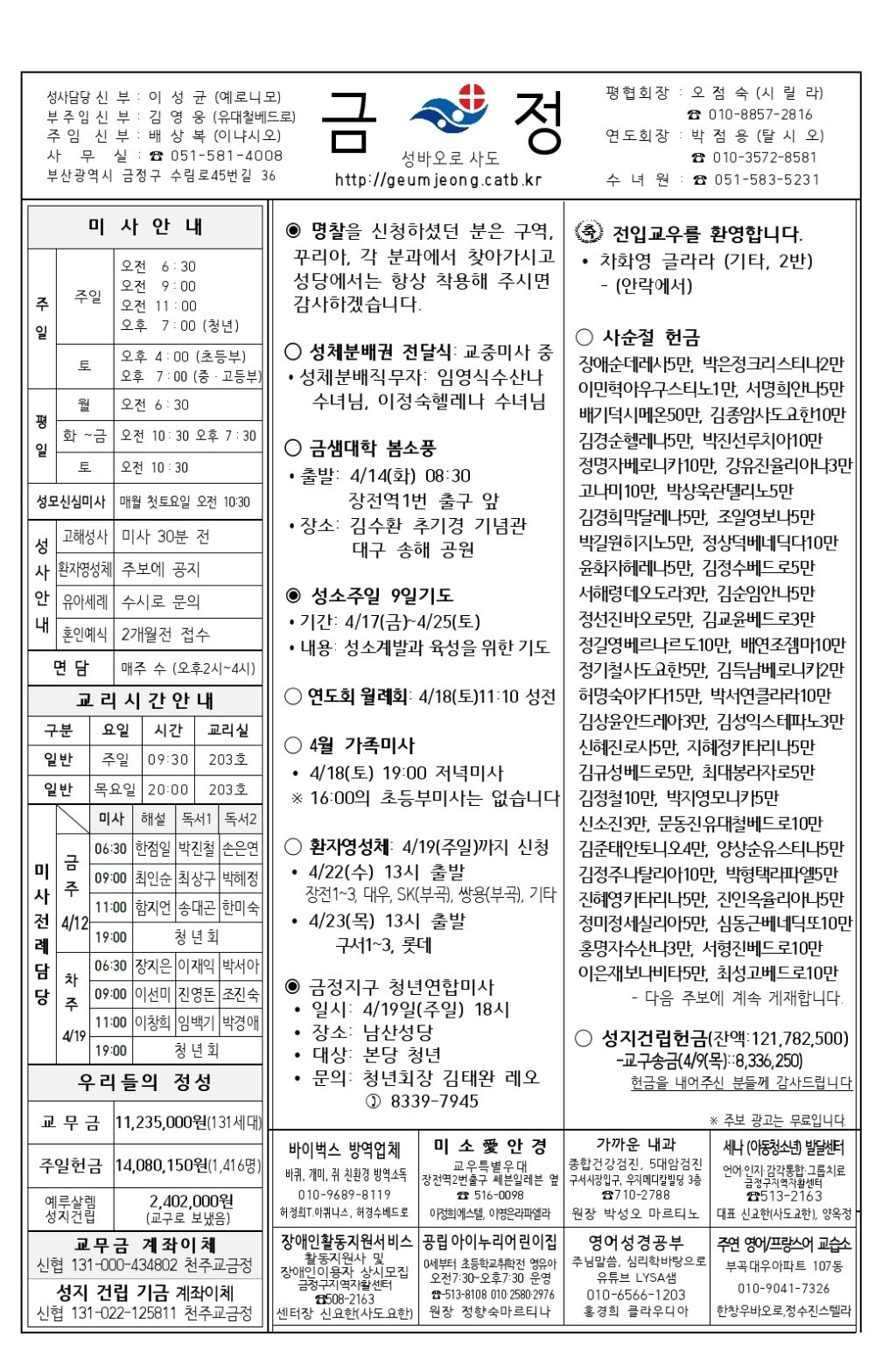 4월12일 본당 주보 작성자김광태(홍보분과)|작성시간26.04.09|조회수37 목록 댓글 0 글자크기 작게가 글자크기 크게가 다음검색 현재 게시글 추가 기능 열기 북마크 공유하기 신고 센터로 신고 댓글 댓글 0 댓글쓰기 답글쓰기 댓글 리스트