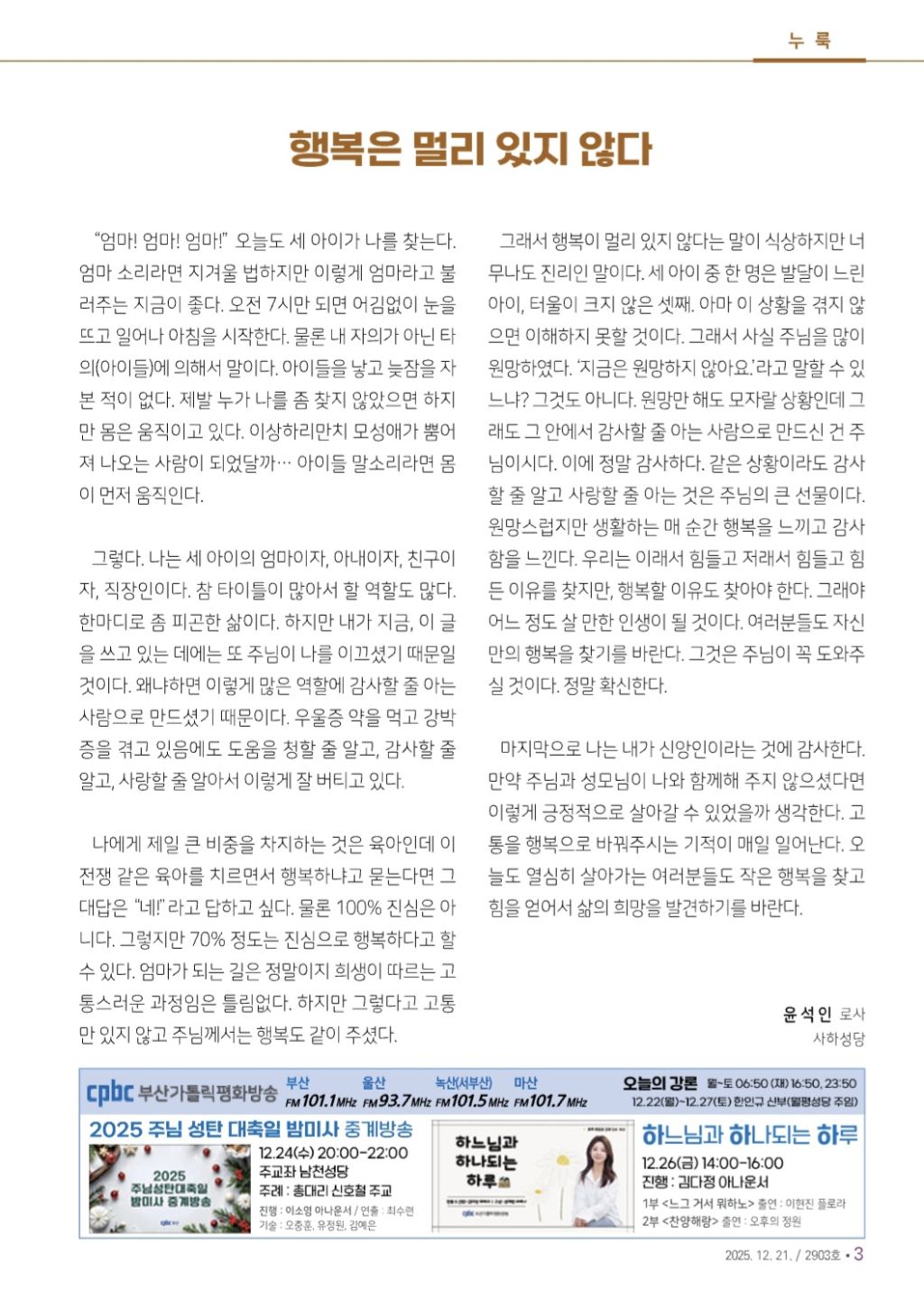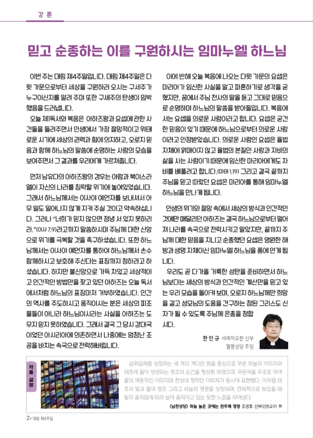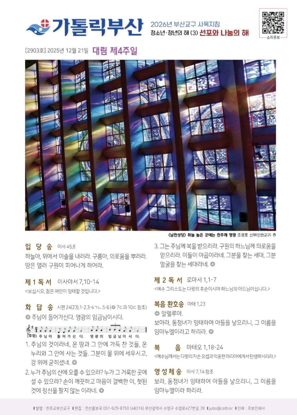 2025년 12월 21일 일요일[자] 대림 제4주일 작성자김광태(홍보분과)|작성시간25.12.18|조회수36 목록 댓글 0 글자크기 작게가 글자크기 크게가 다음검색 현재 게시글 추가 기능 열기 북마크 공유하기 신고 센터로 신고 댓글 댓글 0 댓글쓰기 답글쓰기 댓글 리스트