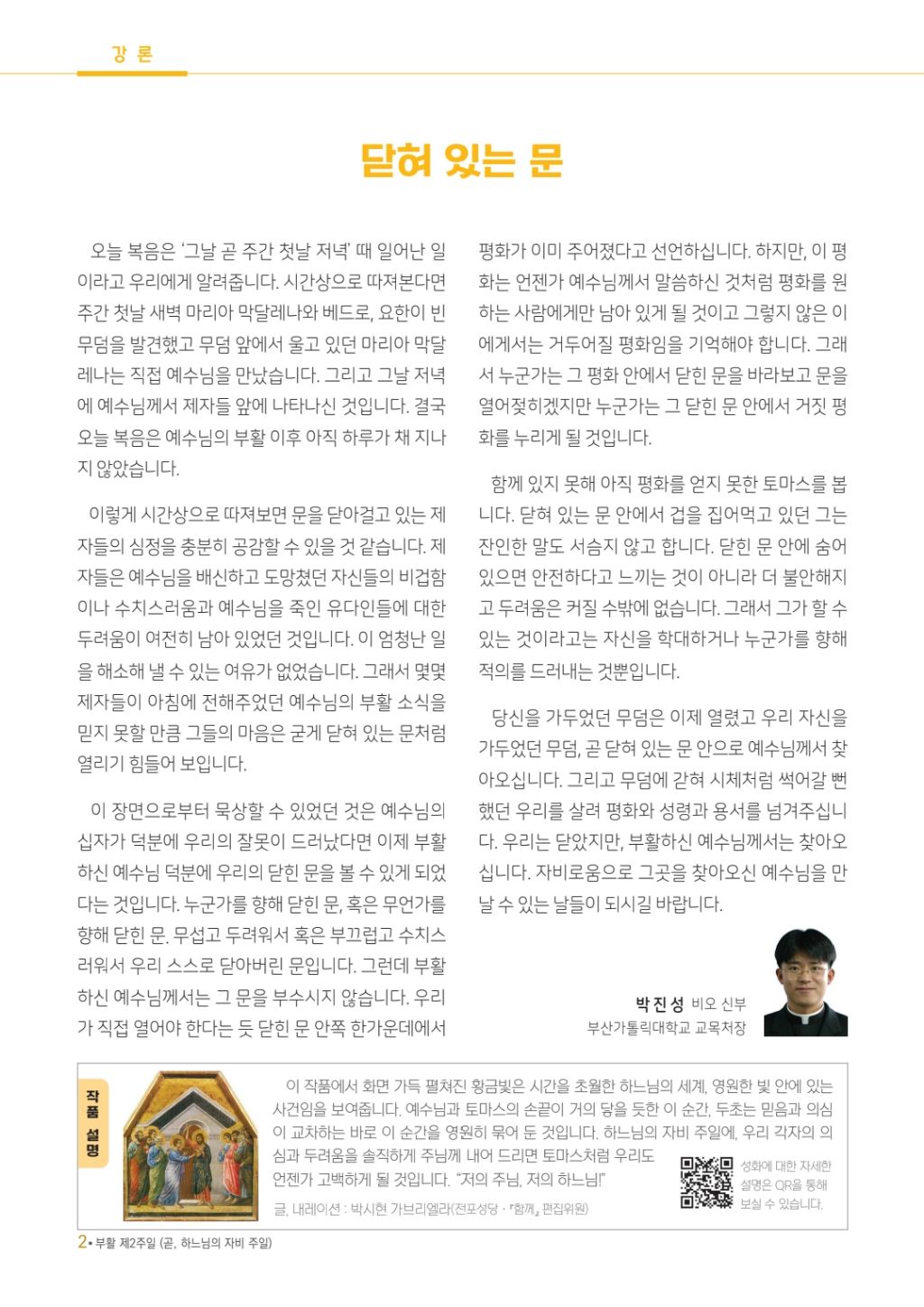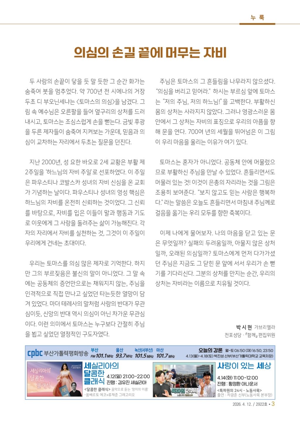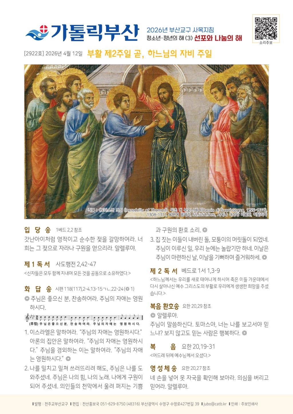 2026년 04월 12일 일요일[백] 부활 제2주일 곧, 하느님의 자비 주일 작성자김광태(홍보분과)|작성시간26.04.08|조회수15 목록 댓글 0 글자크기 작게가 글자크기 크게가 다음검색 현재 게시글 추가 기능 열기 북마크 공유하기 신고 센터로 신고 댓글 댓글 0 댓글쓰기 답글쓰기 댓글 리스트