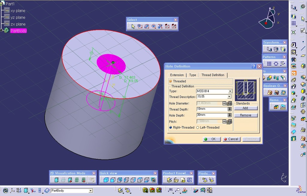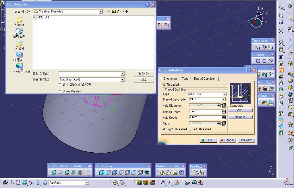 홀의 나사를 낼때 MS규격은 그림1번처럼 MS규격의 텍스트 파일을 불러와서 추가한 후 선택하여 간단히 사용이 가능하다.