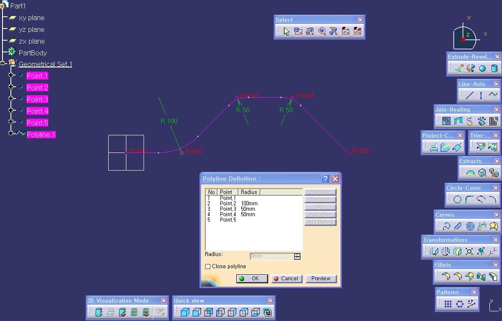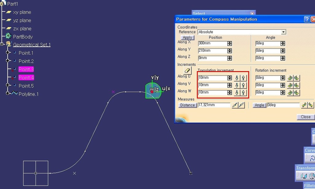컴파스가 이동되고, 컴파스를 더블클릭하여 이동간격을 설정후 드래그로 이동시킨다. 폴리라인 생성에서 라운드 값을 지정 후