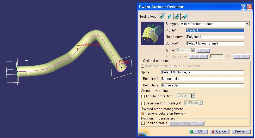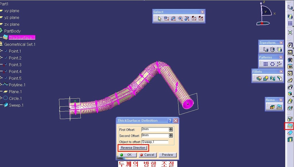(튜브의 관지름의 반값은 반드시 폴리라인의 최소라운드 값보다 커야 한다.) normal to curve로 plan을 생성하고, 여기에