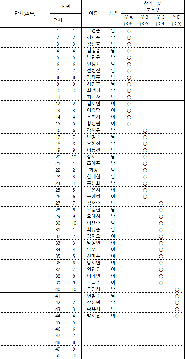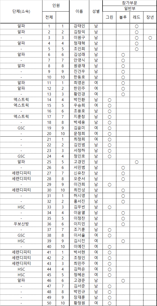 대회 시작전 10~20분정도 미리 오셔서 그룹배정 및 구역별 루트 확인 하시기 바라며 참가자 및 참가부문 체크를 위해 명단을 첨부하오니 확인하시고 누락 혹은 정정 등 기타사항이 있으시면 아래 연락처로 말씀주시기 바랍니다.