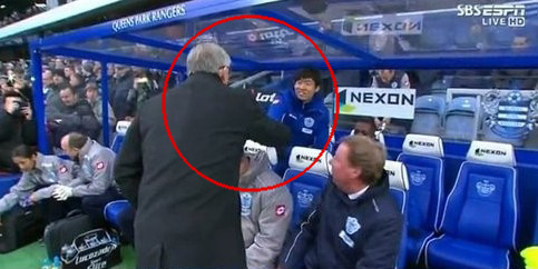 자신에게 온줄알았던 퍼거슨 감독이 박지성에게 손을 내밀자 어리둥절하는 레드넵 감독