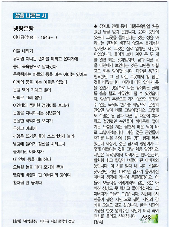 삶을 나르는 시 : 냉탕온탕 - 이태규 작성자청죽|작성시간19.05.01|조회수15 목록 댓글 0 글자크기 작게가 글자크기 크게가 다음검색 현재 게시글 추가 기능 열기 북마크 공유하기 신고 센터로 신고 댓글 댓글 0 댓글쓰기 답글쓰기 댓글 리스트