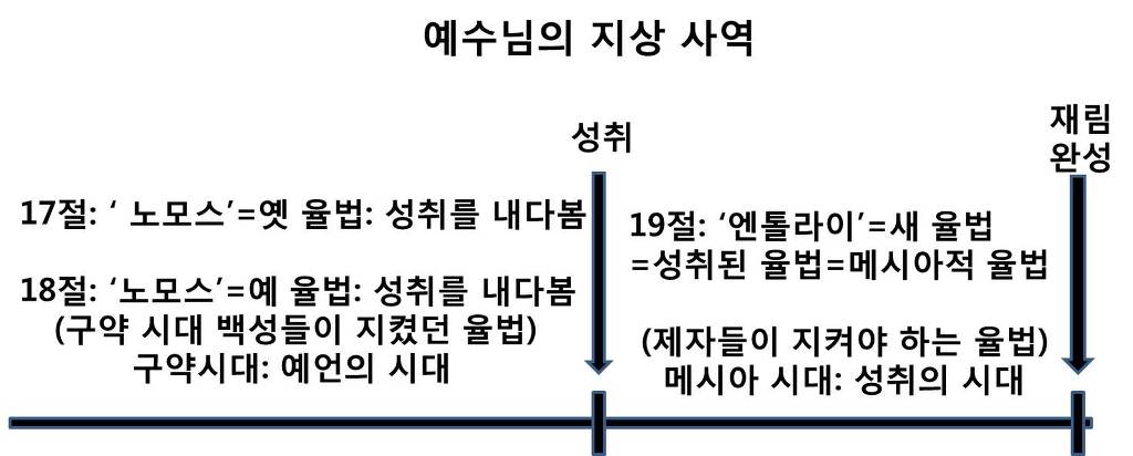 그러면 어떻게 이런 것이 가능할까요? 그것은 구속사의 시간 선상에서 19절에 나오는 ‘계명들’의 지시 대상은 성취이후 시기에 속하지만, 17-18절에 나오는 ‘율법’의 지시 대상은 명백히 성취이전 시기에 속하기 때문입니다. 이러한 시기적 구분을 양용의 교수님이 도표로 그려서 다음과 같이 잘 설명했습니다.