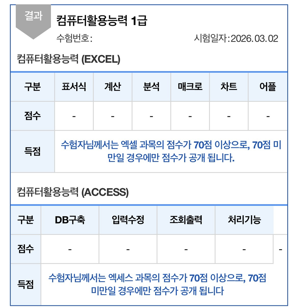 합격 인증입니다 ! 작성자마진혁|작성시간26.03.17|조회수33 목록 댓글 1 글자크기 작게가 글자크기 크게가 한달 반 정도 걸렸네요 ! 여러번 치면서 느낀건데 엑셀 계산 파트는 시험이랑 아예 똑같네요. 좋은 강의 감사합니다 ㅠㅠ 다음검색 현재 게시글 추가 기능 열기 북마크 공유하기 신고 센터로 신고 댓글 댓글 1 댓글쓰기 댓글 리스트 작성자일체유심조 | 작성시간 26.03.17 컴활 최종 합격 진심으로 축하드립니다^^참고로 월에 2분 추첨하는 '합격 인증 이미지' 이벤트와 달리매주 추첨(인원 제한 없음)하는 '합격수기 이벤트' 진행중이오니 혜택 받아가시면 좋을 것 같아관련 링크 남겨드립니다.https://cafe.daum.net/Compcafe/5XZ7/3180감사합니다! 댓글 전체보기