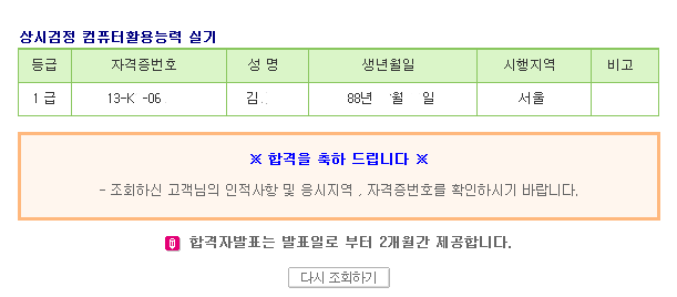 실기는 정말 어렵다고 들었는데 정익종쌤이 상설문제를 복원을 많이, 잘 해주셔서 문제도 많이 풀어볼수 있어서 좋은 결과가 나온 것 같아요!!ㅋ 매 강의시작할 때마다 " 쉿! Follow me! " 하셨는데 진짜 말하신 그대로 따라갔더니 한방에 합격했네요ㅋ 정말 감사합니다!!ㅋ 그리고 지금 컴활1급 실기 준비하시는 분들도 한방에 합격하셨으면 좋겠습니다!!